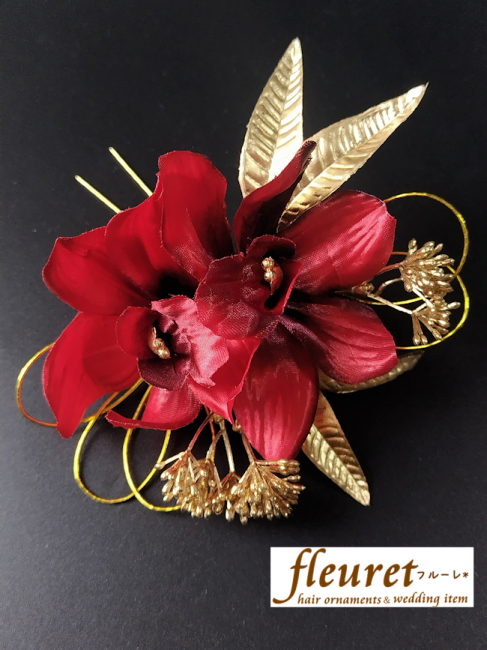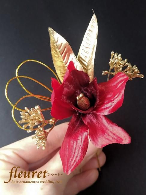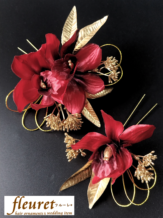 成人式の振袖や卒業式の袴、和装ウェディングの色打掛におすすめの和装髪飾りです。 造花を使用しています。 赤色のランに、ゴールドの小花と葉が映えるデザイン。 赤とゴールドのみでまとめ、すこしクールな印象の和装髪飾りに仕上げました。 Uピンの髪飾り2点セットです。 ※お使いの端末のモニターによって、実物と色の見え方が異なる場合がございます。 特に赤色は見え方に差が出やすいのでご注意ください。 こちらの髪飾りは、暗めの落ち着いた赤色をメインにデザインした髪飾りです。