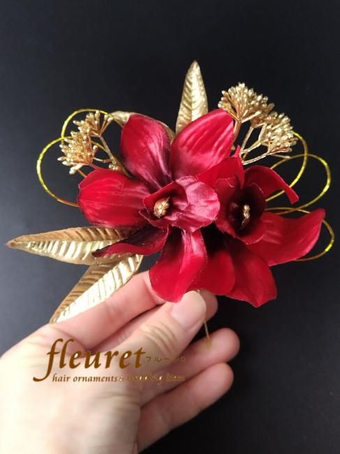 造花の和装髪飾り 赤 ゴールド 成人式 色打掛